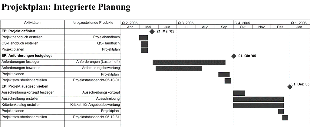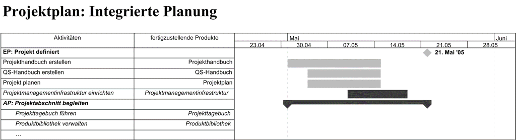 Die Entscheidungspunkte dienen dem Projektleiter Dr. Odysseus als Grundgerüst und als oberstes Ordnungskriterium für die Projektplanung. Um die Integrierte Planung im Projektplan zu erstellen, plant Dr. Odysseus zunächst die Aktivitäten zur Erstellung der Produkte der Entscheidungspunkte ein, also der Produkte, die er der MaPaTUM vorlegen muss. Dabei plant er vorsichtshalber einen zusätzlichen Puffer von einigen Tagen ein, damit die Produkte auf jeden Fall rechtzeitig zum Entscheidungspunkt vorgelegt werden können.