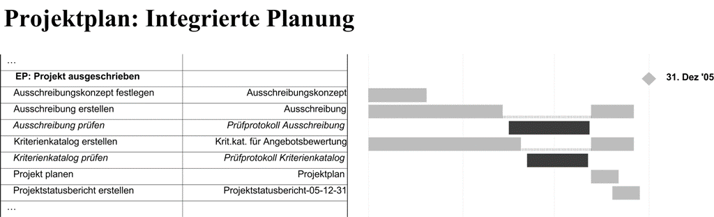 Aus dem QS-Handbuch weiß Dr. Odysseus also, dass unter anderem die Produkte Ausschreibung sowie Kriterienkatalog für die Angebotsbewertung geprüft werden sollen. Also plant er für diese Produkte Prüfungen ein. Bei dieser Planung ist, wie in obigem Beispiel dargestellt, zu beachten, dass nach erfolgter Prüfung durch Herrn Prometheus noch dessen Kommentare eingearbeitet werden müssen.