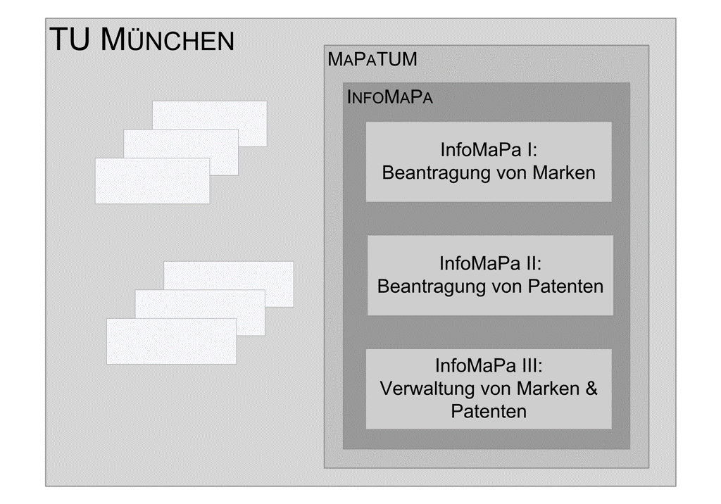 unterstützen. Für jede anzumeldende Marke beziehungsweise jedes zu beantragende Patent wird eine elektronische Akte mit Daten angelegt, geprüft und gegebenenfalls per Fax an das Deutsche Patent- und Markenamt (DPMA) weitergeleitet. Alle vorhandenen Akten werden in einem elektronischen Auskunftssystem der Öffentlichkeit zugänglich gemacht. Das System InfoMaPa muss benutzerfreundlich und zuverlässig sein. Jeder Mitarbeiter der TU München soll es ohne große Einarbeitungszeit einfach nutzen können. Da die Akzeptanz der Benutzer entscheidend ist, empfiehlt sich die Aufteilung des Projektes in sukzessive durchzuführende Projektstufen. Im Erfolgsfall, das heißt, wenn das neue System bei den Anwendern auf Zustimmung stößt, viel genutzt wird und sich rechnet, werden die weiteren Projektstufen angestoßen. |