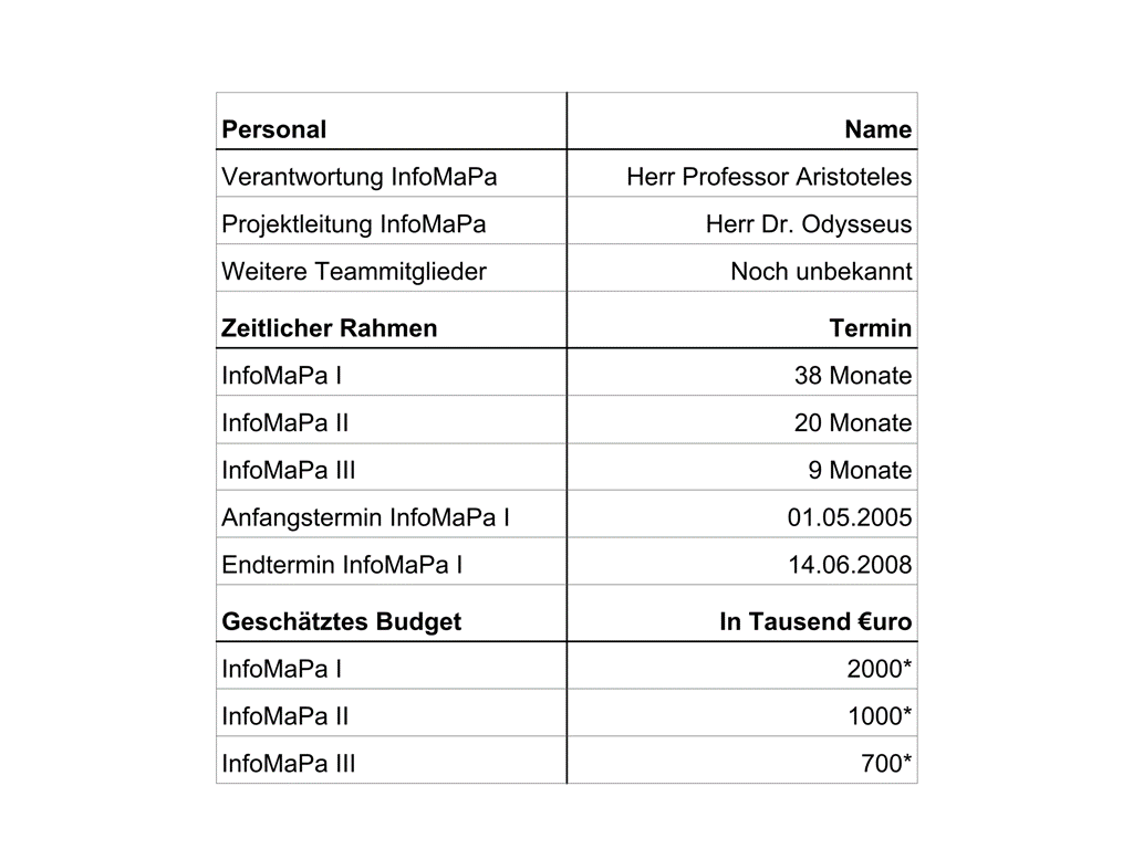 Die Finanzierungsfrage hat er zwar schon mit dem Verwaltungsangehörigen der MaPaTUM Herrn Dipl. Ing. Platon geklärt. Dennoch steht ihm kein unbeschränktes Budget zur Verfügung und der Verwaltungsrat muss dem Projektvorschlag erst noch zustimmen. Um dem Verwaltungsrat die Entscheidung zu erleichtern, plant Dr. Odysseus eine Projektdurchführung in drei Projektstufen, von denen vorerst nur die erste finanziert werden muss. Für diese drei Projektstufen schätzt er den Aufwand aus dem Bauch heraus, um dem Verwaltungsrat ein Gefühl für die Größe des Projektes zu geben.