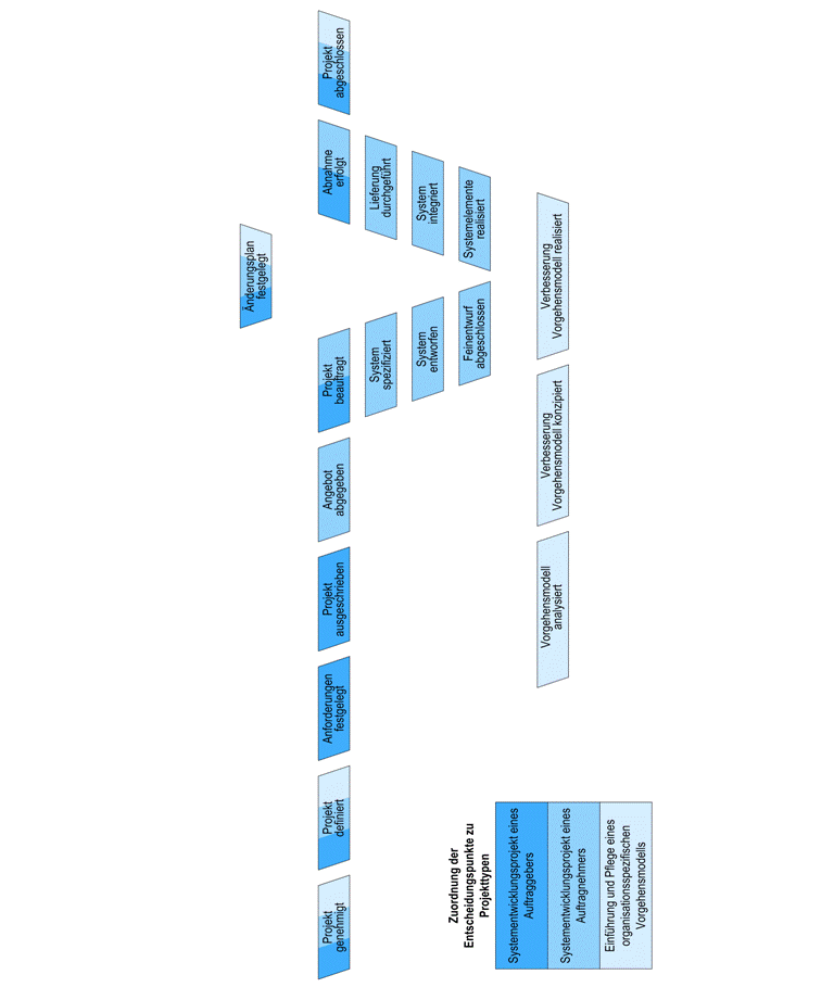 Dabei werden die Entscheidungspunkte Projekt genehmigt, Projekt definiert, Änderungsplan festgelegt und Projekt abgeschlossen in allen Projekttypen und damit auch in allen Projektdurchführungsstrategien verwendet. Der Projekttyp Systementwicklungsprojekt eines Auftraggebers umfasst zusätzlich die Entscheidungspunkte Anforderungen festgelegt , Projekt ausgeschrieben, Projekt beauftragt und Abnahme erfolgt.