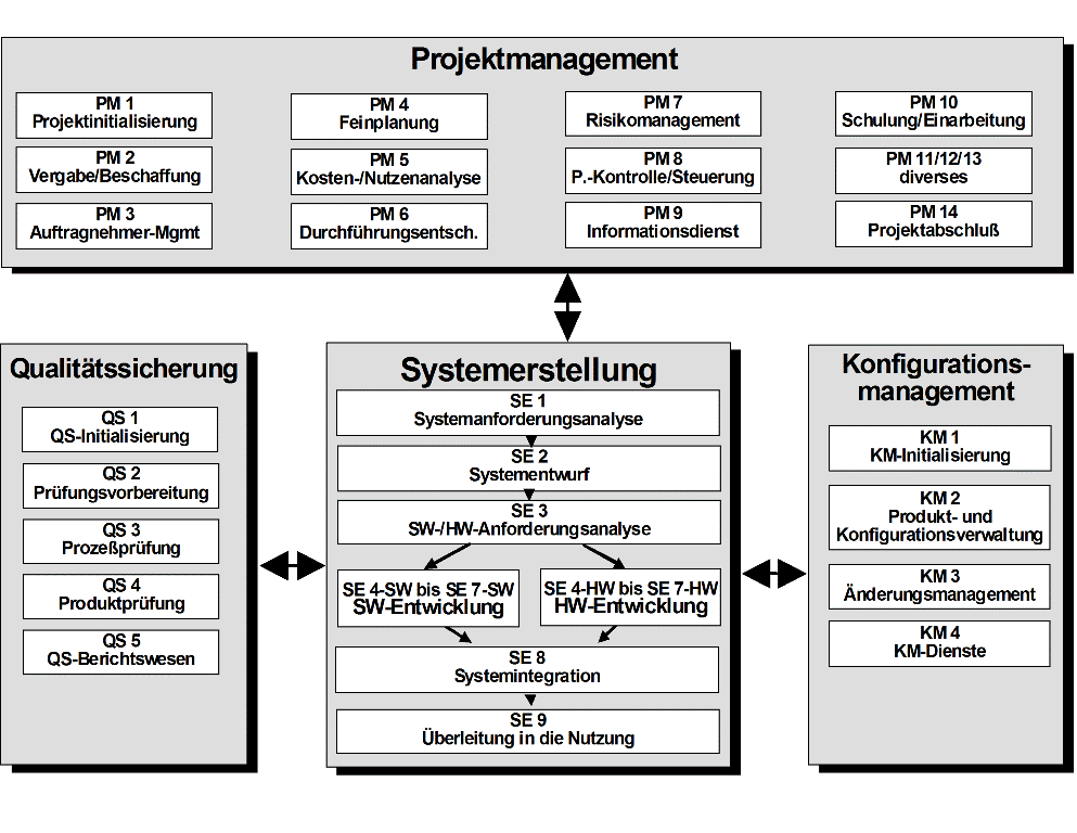 Strukturell unterscheiden sich das V-Modell 97 und das V-Modell XT erheblich. Das V-Modell XT ist aus so genannten Vorgehensbausteinen aufgebaut, das V-Modell 97 in vier Submodelle (siehe Abbildung 2 ) gegliedert: