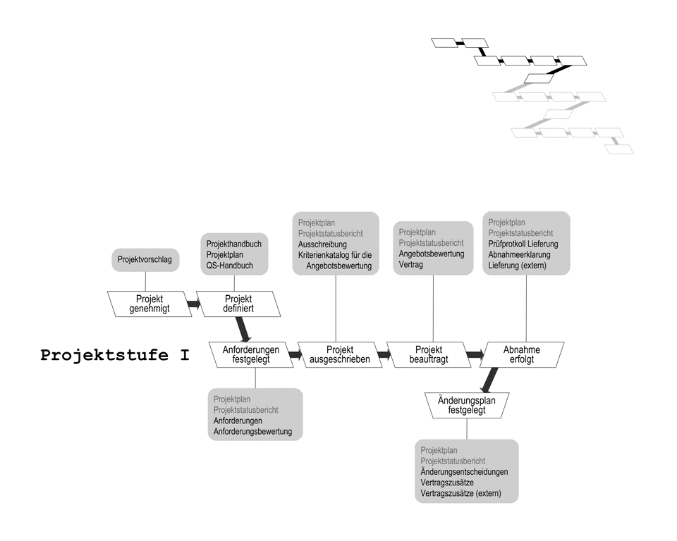 Um das Beispielprojekt nun etwas detaillierter zu betrachten, konzentrieren wir uns im Weiteren auf den Projektanfang und die erste Projektstufe. Wir extrahieren somit aus dem Gesamtablauf die ersten sieben Entscheidungspunkte. In Abbildung 2 sind jedem Entscheidungspunkt die dem Management vorzulegenden Produkte annotiert. Die Produkte Projektplan und Projektstatusbericht sind hervorgehoben dargestellt, da sie mehrfach vorgelegt werden.