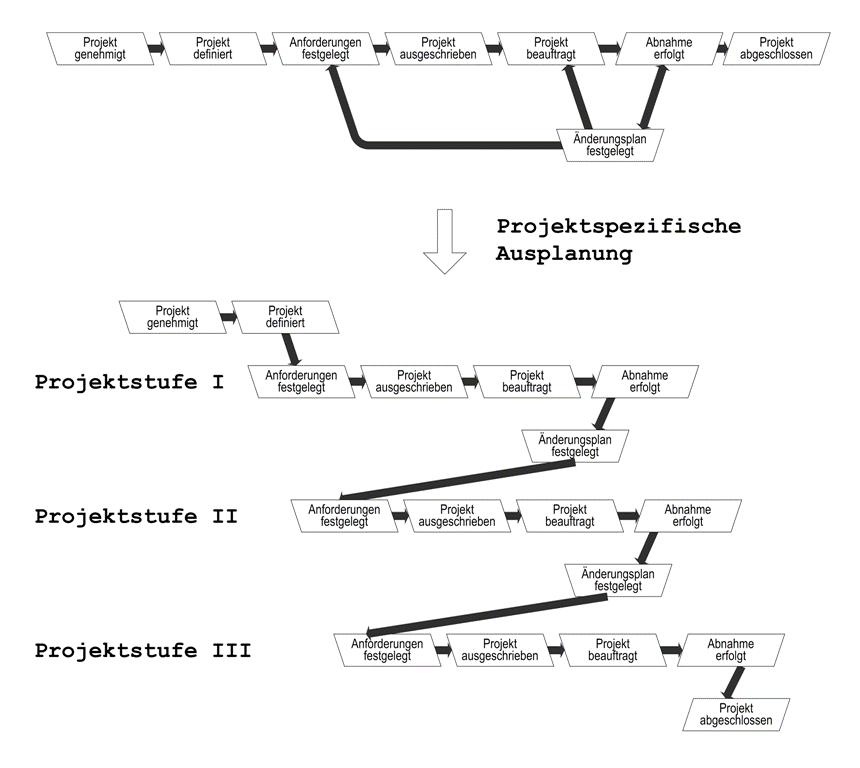 Bei der Erstellung von InfoMaPa wird zuerst ein Teil des Systems, nämlich das Teilsystem zur Beantragung von Marken, erstellt und nur bei ausreichender Akzeptanz dieses Systems durch die Anwender werden die folgenden zwei Teile, die Beantragung von Patenten und die Verwaltung von Marken und Patenten, beauftragt. Wie Abbildung 1 illustriert, untergliedert sich InfoMaPa demnach in drei Projektstufen. Eine Projektstufe bezeichnet die Zeitspanne zwischen zwei (Teil-)Lieferungen eines Auftragnehmers. Die Entscheidungspunkte Anforderungen festgelegt, Projekt ausgeschrieben, Projekt beauftragt und Abnahme erfolgt werden für jede Projektstufe jeweils einmal eingeplant.