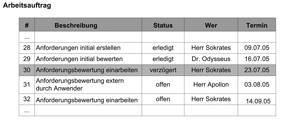 Einen Ausschnitt der Aktionsliste, in der der Projektleiter Dr. Odysseus die Aufgaben seines Teams einträgt und den Status der Bearbeitung verfolgt, zeigt das folgende Beispiel.