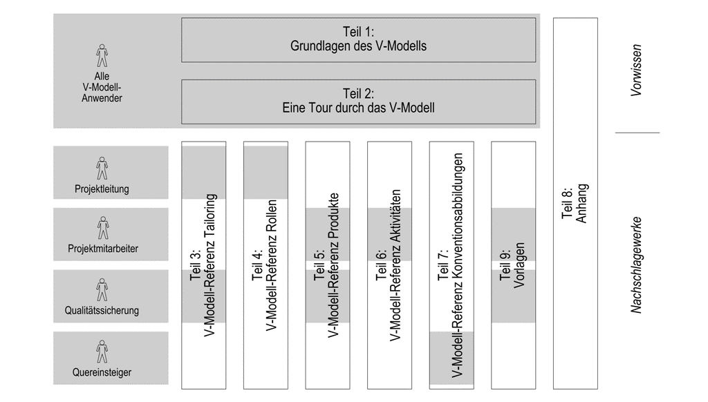 Ein grundlegendes Verständnis der ersten beiden Teile ist Voraussetzung für die erfolgreiche Anwendung des V-Modells im Projekt. Die nachfolgenden Teile 3 bis 6 sind V-Modell-Referenzen. Eine V-Modell-Referenz ist eine spezifische Sicht auf die Inhalte des V-Modells. Diese V-Modell-Referenzen müssen nicht im Vorfeld eines Projektes vom V-Modell-Anwender gelesen werden. Vielmehr dienen die V-Modell-Referenzen und die Teile 8 und 9 als Nachschlagewerk während der Projektdurchführung.